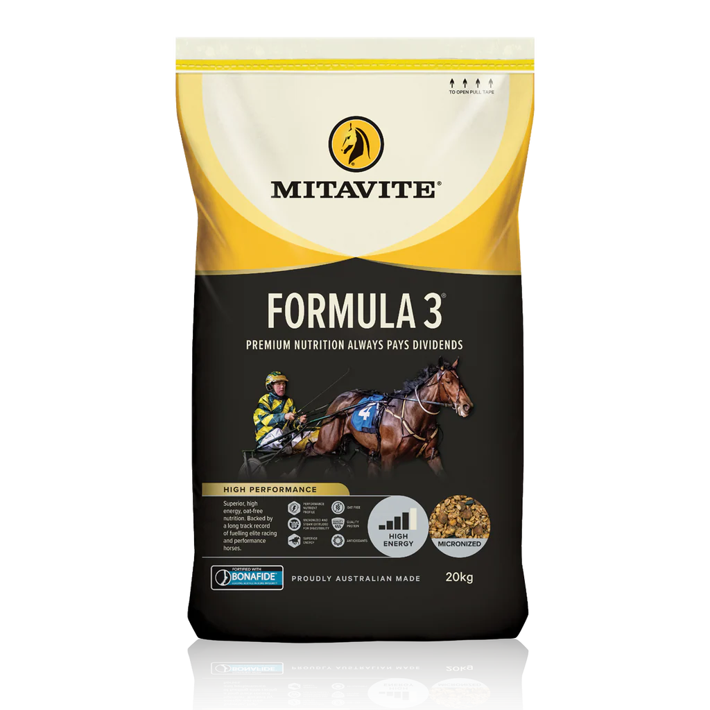 Mitavite Formula 3® is a high-performance, oat-free muesli designed for horses in intense work, such as racing or high-level competition. This premium, steam-extruded feed provides a balanced energy profile from oils, cereal grains, and soluble fiber, ensuring sustained stamina without the “fizz” often associated with whole oats.