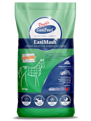 - Feeding Guide: Can be fed dry or soaked (add 0.5L of cold or warm water to every 1kg of EasiMash). It is introduced gradually into a horse’s ration over two weeks.